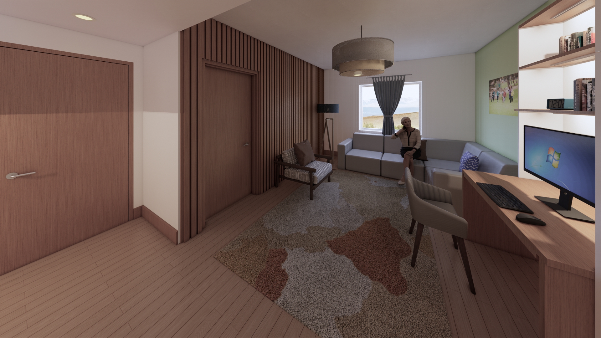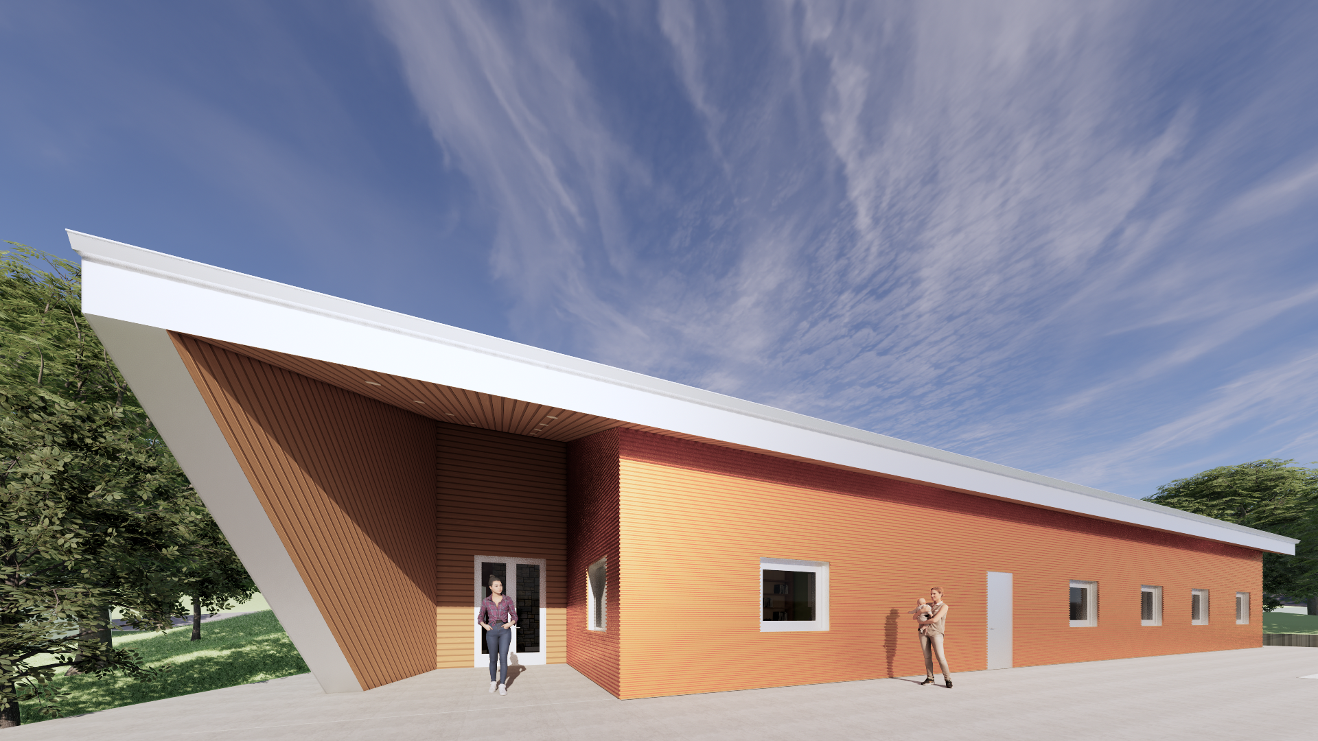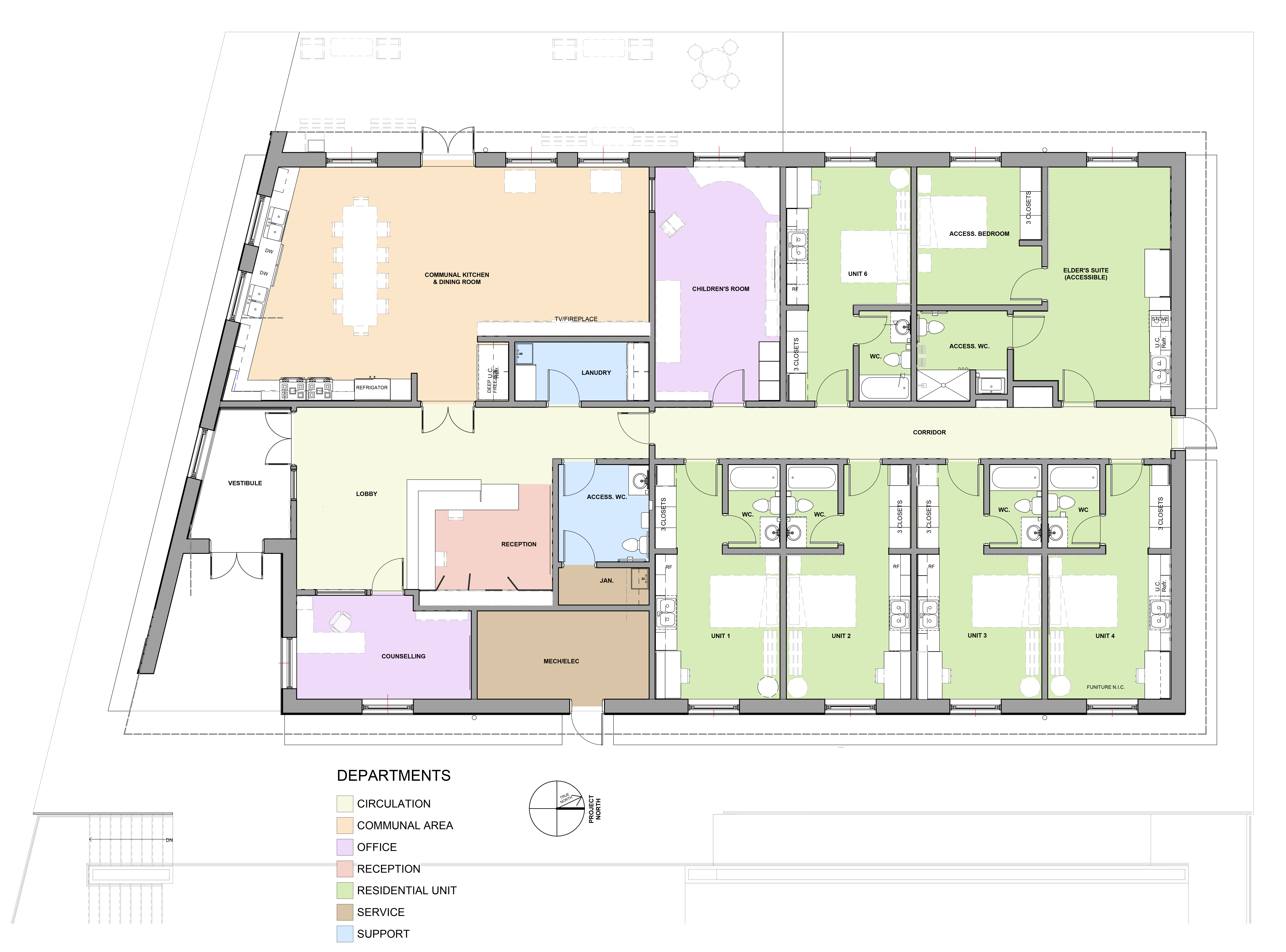 The proposed building is a single-storey slab-on-grade prefabricated light wood-frame building. The building will include 6 residential units (consisting of 5 typical residential unit and 1 accessible residential unit), children’s room, communal kitchen, dining area, counselling room, and associated administrative spaces.